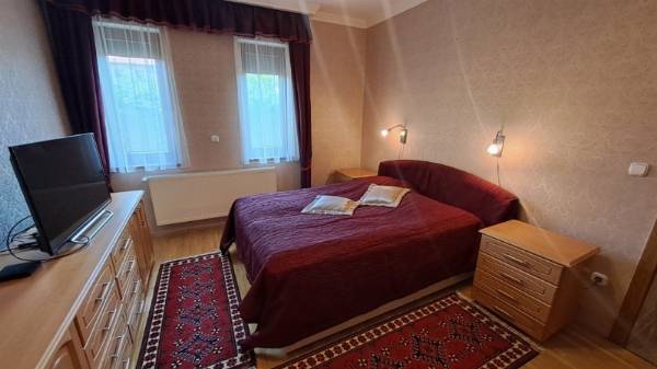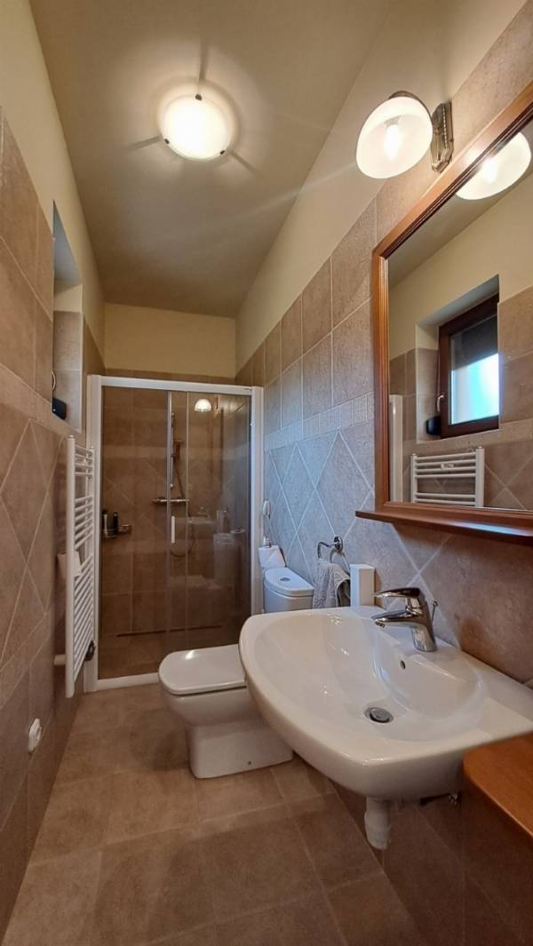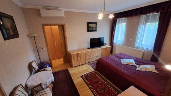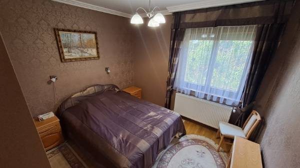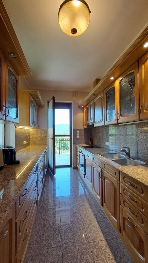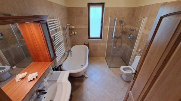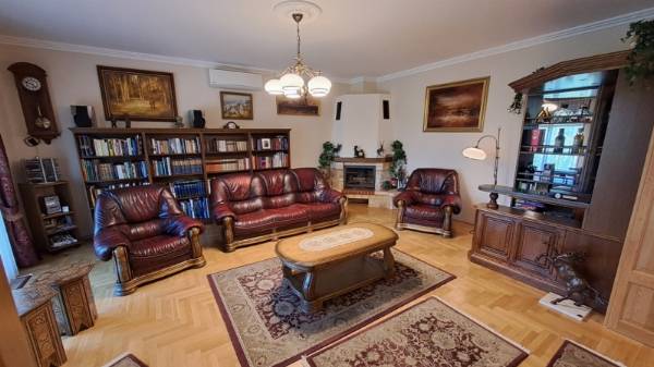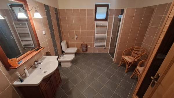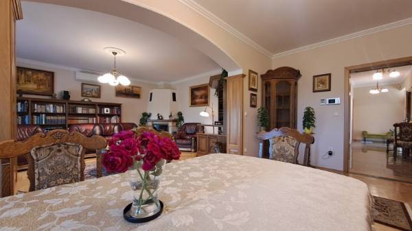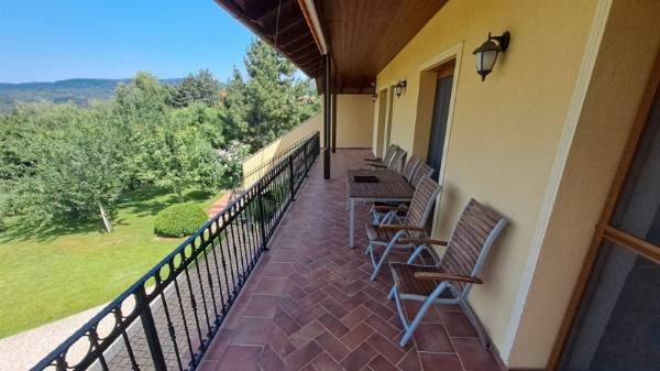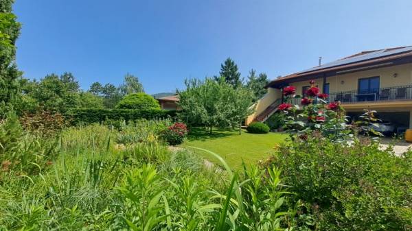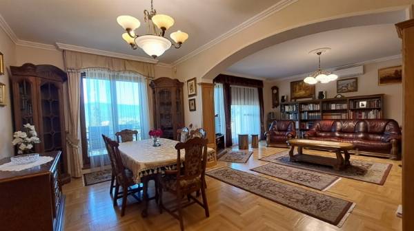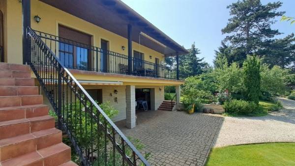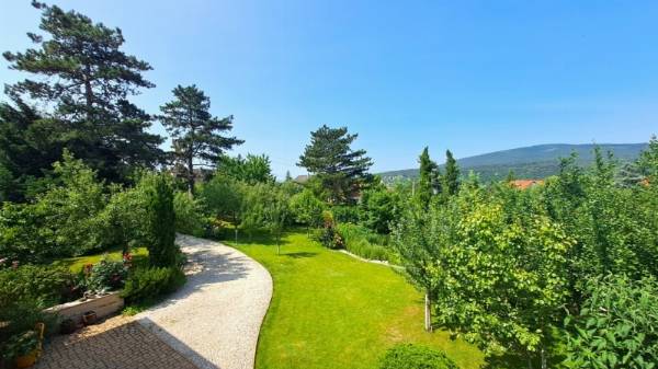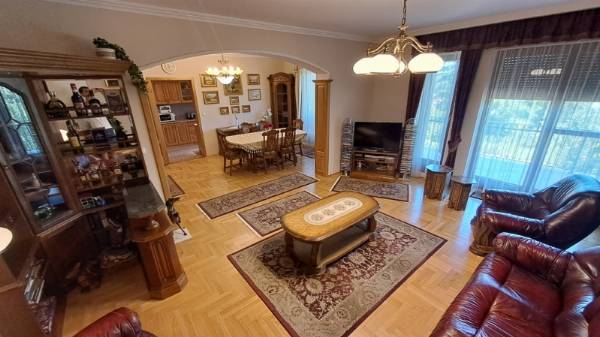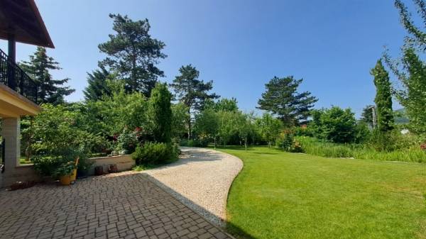 Pécs - Mecsekoldal Donátus részén, rendkívül nyugodt, gyönyörűen parkosított mesés környezetben, Jakab-hegyi panorámával egy mediterrán hangulatú 270 m2-es luxus családi ház eladó! A ház egy 2075 m2-es gyönyörűen parkosított, ősfák által körülvett és eldugott, nagyon rendezett telken helyezkedik el. A telek összközműves és teljesen sík. Található rajta erdei fenyő, gyümölcsfák, zöldséges, gyömölcsös, egy nagyon hangulatos kerti dísztó, továbbá egy faragott kőszobor kerti kiülő résszel, melyek még tovább emelik a park hangulatát. Az impozáns épület 2010-ben épült, összesen 270 m2 lakótérrel, tágas terekkel rendelkezik, és belső kétszintes kialakítású. Az építés során magas minőségű anyagokat használtak fel. Alsó szinten található helyiségek: - nagy méretű garázs, ahol a műhely saroknak is bőven van hely, - egyedi hangulatú étkezős konyha, innen nyíló hangulatos boros pincével, - külön nyíló hálószoba, - zuhanyzóval és infra szaunával ellátott fürdőszoba, - kazánház. Felső szinten található helyiségek: - rusztikus stílusú bútorokkal berendezett rendkívül tágas nappali étkezővel és kandallóval, - hosszú konyha két oldalt beépített szekrényekkel. Innen kijuthatunk a kb. 30 m2-es mediterrán hangulatú, kovácsoltvas korláttal ellátott teraszra, ahonnan páratlan, Jakab-hegyre néző panoráma tárul elénk, - 2 külön fürdőszoba, az egyik zuhanyzóval, a másik káddal és zuhanyzóval is fel lett szerelve, - 2 külön nyíló kényelmes méretű háló szoba, az egyikből nyílik egy gardrób helyiség is. Az elrendezés egyébként nagyon praktikus, minden helyiség a hosszú közlekedőből nyílik külön. Kialakítása miatt alkalmas lehet akár két generáció számára is, az alsó és a felső szint is rendelkezik külön bejárattal. Műszaki paraméterek és anyaghasználat: A külső nyílászárók minőségi fa ablakok, redőnnyel szerelve. A fűtést és a meleg víz ellátást kombi gázkazán szolgáltatja. A ház 12 kW napelem rendszerrel is fel lett szerelve, ami teljes egészében fedezi az elektromos áram felhasználást. Klíma is beszerelésre került. Mindkét szinten a konyhapult, illetve a közlekedőben és a fenti konyhában található padló, valamint a lépcső is ugyanazt a rózsagránit burkolatot kapta. A lakó helyiségekben jó minőségű fa parketta burkolat található. További extraként megemlítendő, hogy a kertben található egy 49 m mély fúrt kút, a különleges növények öntözését pedig egy automata öntöző rendszer segíti. Ezen kívül található még egy szerszámok tárolására alkalmas melléképület, alatta egy pincével. Az ingatlanban található bútorok szintén megegyezés tárgyát képezhetik. Jöjjön el, nézze meg és szeressen bele.