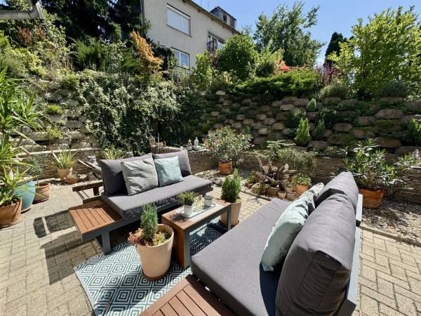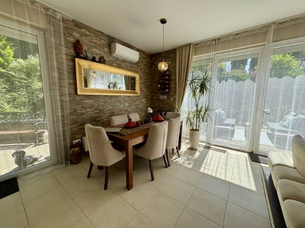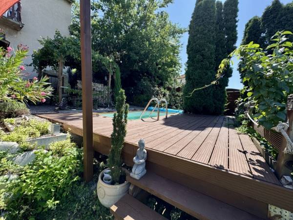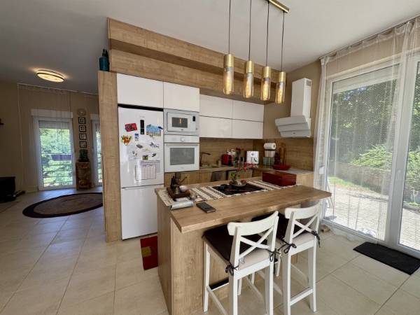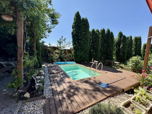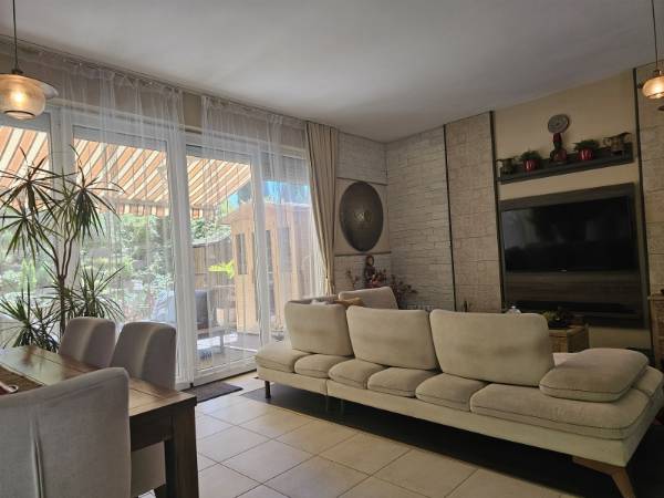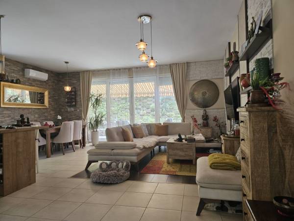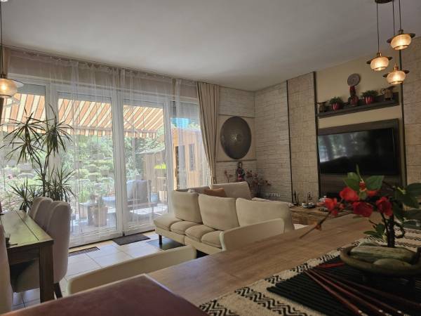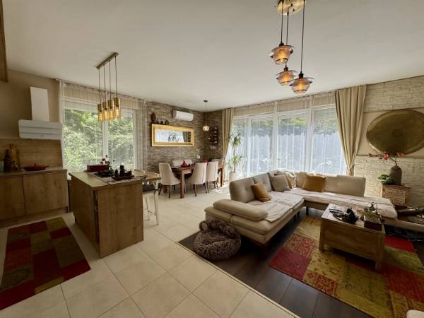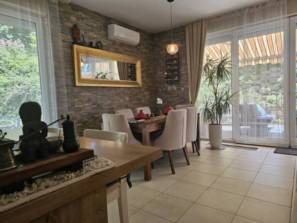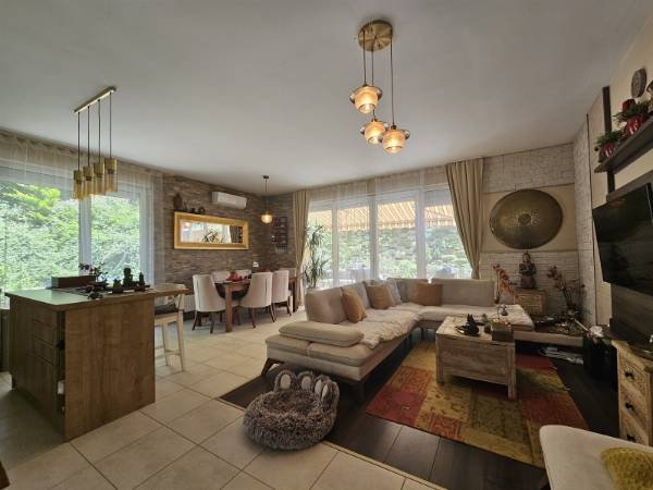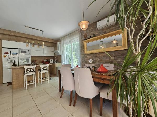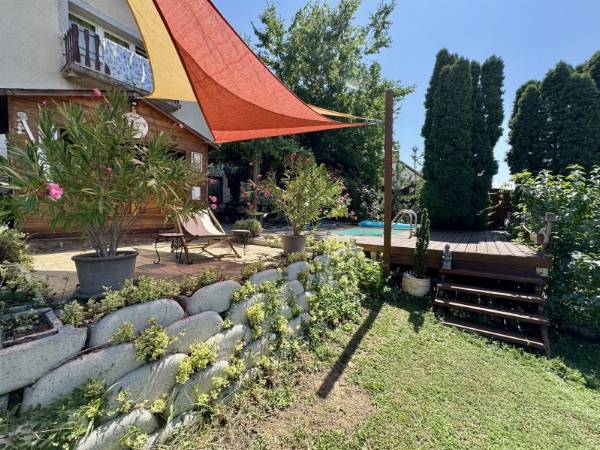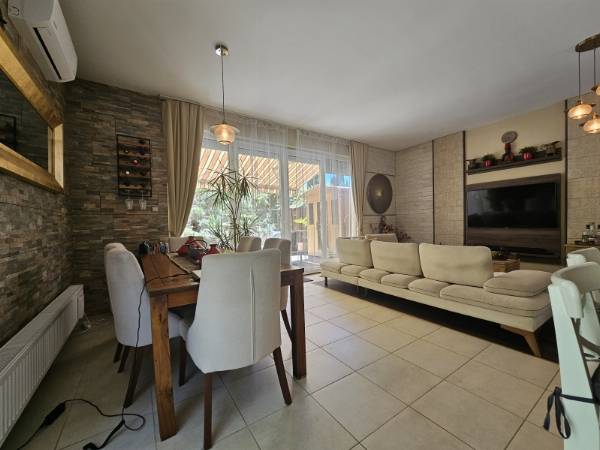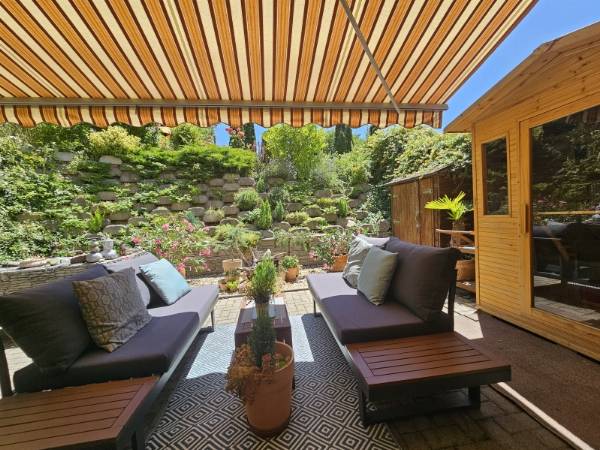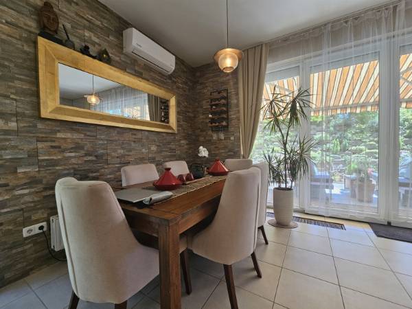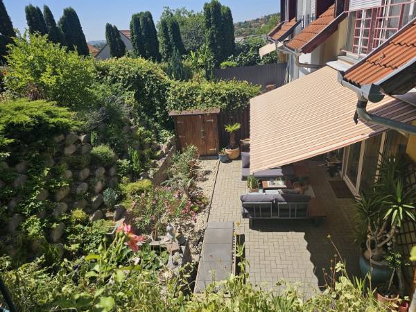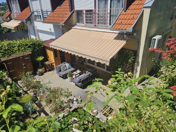 Pécs Mecsekoldal-Rigóderi részén különleges adottságokkal rendelkező kertkapcsolatos lakás eladó ! A három lakásos társasház 2008-ban épült. A belső két szintes ingatlanhoz tartozik egy csodálatosan kialakított kert, ebből kettő teraszként és egy kerti rész,ahol pezsgőmotoros polipropilén medence, pari házikó,szőlővel befuttatott pergola, sütögető és étkező rész lett kialakítva. A kertben szebbnél szebb növényekkel van beültetve,igazi mediterrán hangulatot teremtve. A kerti részről csodás Mecseki panorámában gyönyörködhet az új tulajdonos. Az alsó szint a teremgarázs szintje,ahol még egy saját tároló is tartozik az ingatlanhoz.Itt kapott helyet a gáz cirko kazán amihez egy vízlágyító is hozzá lett kötve. A lakásba érve egy tágas egy légtérben lévő előszoba-nappali-konyha étkező lett kialakítva. Három oldalról ablakokkal, ennek köszönhetően gyönyörű napfényes és tágas . A különleges nyugalmat árasztó déli terasz kerti csobogóval, virágokkal. Az alsó szinten még egy wc-mosdó is ki lett alakítva. Az emeleti szinten kádas fürdőszoba dupla mosdó,wc-bidé, itt kapott helyet a mosógép is.Két nagy méretű szoba is az emeleti szinten található. Minden szoba klimatizált. A hálószobák radiátorral fűtöttek,a többi helyiségben padlófűtés található. A nyílászárók elektromos redőnnyel szereltek. Az elektromos nyitóval ellátott gépkocsibeálló ára +5.9 millió forint. Egy igazi gyöngyszem az eladó ingatlanok kínálatában. Jöjjön tekintse meg és tegyen egy ajánlatot !