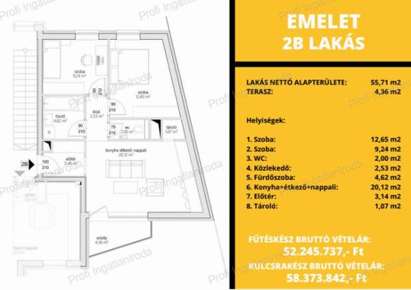 Kapuvár központi részén 8 lakásos társasházban kinálunk nappali +2 szobás, és nappali +1 szobás társasházi lakásokat, fűtéskész állapotban, megbízható, sok referenciával rendelkező kivitelezőtől. kezdés 2025 augusztus, 2026 november végi átadás 1. emelet: 2 B jelű lakás nappali +2 szobás, 55,71 m2 + 4,36 m2 erkéllyel. Bruttó fűtéskész ár: 52.245.737 Ft ,kulcsrakész ár 58.373.842 Ft A lakások ára 5% áfát tartalmaz. A lakás elosztása: szoba 12,65 m2, szoba 9,24 m2, WC 2 m2, közlekedő 2,53 m2, konyha étkező nappali 20,12 m2, előtér 3,14 m2, fürdő 4,62 m2, terasz 4,36 m2, tároló 1,07 m2 Magas műszaki tartalom: - külső falak 30 cm égetett kerámia blokkból, válaszfalak 10 cm kerámia blokkból, a lakások közötti fal hangszigatelő kéregpanelből épül. - homylokzatra 15 cm szigetelés kerül - központi kazán, lakások egyedi mérővel felszerelve - padlófűtés - 3 rétegű bukó-nyíló műanyag ablakok - erkély burkolva, üvegkorláttal ellátva kerülnek átadásra - zárt lépcsőház, festve és burkolva - elektromos hálózat, kaputelefon, TV, internet alapszerelve - zárt udvari gépkocsibeálló vásárolható 2.100.000 Ft - parkosított udvar Igény szerint vállaljuk a kulcsrakész befejezést. - beltéri ajtók beépítve - beltéren glettelés festés - hideg meleg burkolás - szaniterek felszerelése - kapcsolók, dugaljak felszerelése Ügyfeleimnek az adásvétel teljes körű lebonyolítását vállalom. Az első megtekintéstől a beköltözésig számíthat rám! Irodánk ügyvédi szolgáltatással és díjmentes, bank független CSOK, Babaváró hitel, kamattámogatott és piaci hitelek ügyintézésével áll rendelkezésükre. További kérdéseivel keressen bizalommal: Pfeiferné Zsuzsa
