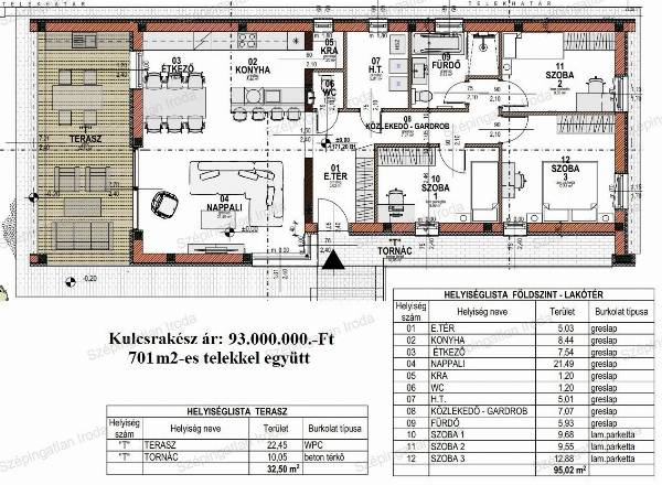 A Szépingatlan Iroda eladásra kínál Fertőszéplakon, kialakulóban lévő családi házas övezetben, 701 m2-es telekre tervezett önálló családi házat. A telekre az építési szabályzat szerint 1 db családi ház építhető 30 %-os terület felhasználásával. Ennek az az előnye, hogy a környezet szellős marad, megfelelő távolság keletkezik a szomszédos épületek között. Az épület 30 cm-es tégla szerkezetű, fa födémes,a tetőre beton cserép kerül a tervdokumentációban meghatározott színben. A válaszfalak YTONG válaszfal lapokból készülnek, kétoldali vakolattal, kétrétegű fehér színű festéssel. A homlokzatra 15 cm EPS dryvit hőszigetelő rendszer, 3 rétegű, fokozottan hőszigetelt üvegezésű külső nyílászárók kerülnek beépítésre, kívül színes, belül fehér kivitelben, vakolható tokos fehér színű, műanyag redőnyökkel. A bejárati ajtó 5 ponton záródó biztonsági ajtó, bevilágító ablakkal, színben harmonizál a többi nyílászáróval. A Kivitelezővel megállapodott árban minden helyiségbe, igény szerint választható burkolatok és dekorfóliával ellátott, utólag szerelt beltéri ajtók kerülnek beépítésre. A nettó 95 m2-es lakóingatlanban előszoba, a nappali-konyha-étkező 22 m2-es fedett teraszkapcsolattal, három hálószoba, fürdőszoba, külön WC, a gépészeti, illetve a háztartási helyiség található. A helyiségek rendkívül tágasak, fekvéséből adódóan minden napszakban jó benapozottságúak. Az épület fűtése és a használati meleg víz szolgáltatás levegő hőszivattyús rendszeren keresztül történik a lakótéreben padlófűtéssel. Ennek a fűtésrendszernek és a jó szigetelésnek köszönhetően az ingatlan energia felhasználása meglehetősen alacsonyan tartható. Ez a szép, igényes, új ingatlan tökéletes otthona lehet egy családnak, vagy életüket közösen kezdő párnak, de az idősebb korosztálynak is. Babaváró hitel, CSOK Plusz, támogatott hitelek igénybe vehetők! Bankfüggetlen szakértő kollégánk, teljes körű és díjmentes hitelügyintézéssel áll az ügyfelek rendelkezésére. Kérje személyre szabott ajánlatunkat! A projekttel kapcsolatos további kérdésekkel keresse Kollégánkat személyes találkozóra. Tervezett átadás a megrendeléstől számított 10 hónap. Kulcsrakész ára: 93 mFt, mely tartalmazza a telek árát és az épület árát a tervezéstől a 100 % -os kész állapotig. Tervezett átadás a megrendeléstől számított 10 hónap! A Kivitelező referencia ingatlanjai népszerűek, sikeresek, mivel tartja a megállapodott árat és az átadási határidőt. Érd.: +3630 520 6055, szepingatlan.eva@gmail.com