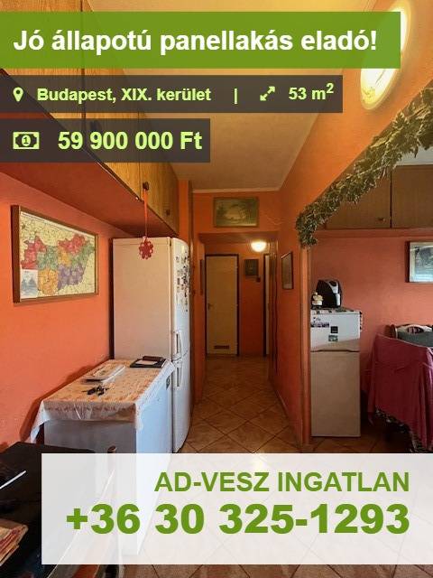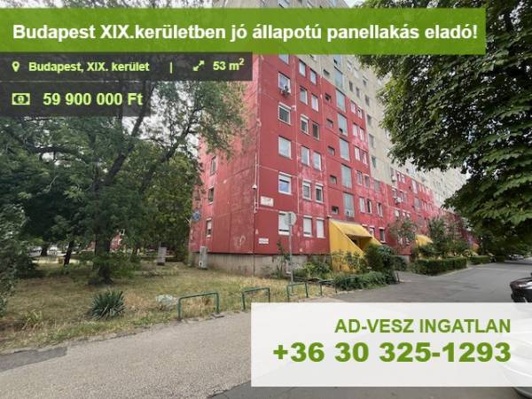ELADÓ Budapest XIX. kerületének közkedvelt, zöldövezeti részén, az Arany János utcában egy jó állapotú, 9.emeleti, szélső, 53m2-es panellakás, liftes, alacsony fenntartási költségekkel. A lakás jellemzői: -9.emeleti, szélső világos lakás -53m2 -2 hálószoba, gépesített konyha - étkező egyben (akár az étkezőből szoba is kialakítható) -külön fürdőszoba, wc -szobák burkolata laminált padló -műanyag nyílászárók, redőnnyel felszereltek. -beépített gardrob szekrények -felújított radiátorok A ház a 80-as években épült,10 emeletes, amelyben lépcsőházanként 32-, emeletenként 3 lakás került kialakításra. Jó állapotú, tiszta, rendezett, jó lakóközösség jellemzi, kamerával felszerelt és örzőtt terület. A lakás Kispest központi, jól megközelíthető részén, az Arany János utcában, az Üllői úttól, és az Ady Endre úttól 5 perc sétára található. Zöldövezetben, nyugodt, csendes környezetben, parkok, kutya játszótér, teniszpálya, játszóterek nyújtanak kikapcsolódási lehetőségeket az ott élők számára. A közelben számos bevásárlási lehetőség (élelmiszer áruházak, Kossuth téri piac, Shopmark, Köki Terminál), általános iskola, óvoda, bankfiókok találhatók. Percek alatt megközelíthető a Határ úti,- és a Kőbánya-Kispest metróállomás, így közlekedés szempontjából is kiváló a lakás elhelyezkedése. Pár perc sétára található a 148-as, és 151-es busz, melyekkel könnyedén elérhető a Kőbánya–Kispest (M3 metróvonal), valamint a 42-es és 50-es villamos is pár percre van. Éjszakai járatok is könnyen elérhetőek: 909, 914, 950, 950A A közlekedés tehát autó nélkül is gyors és kényelmes. Az ingatlan kizárólag irodánk kínálatában megtalálható. Minden korosztály számára jó választás lehet, de jó kiadhatósága miatt befektetésnek is remek lehetőség! Hitelügyintéző kollégánk államilag támogatott kamatozású hitelkonstrukciókkal, és CSOK teljeskörű ügyintézéssel áll rendelkezésére térítésmentesen! Az adásvételi szerződés megkötéséhez igény szerint megbízható ügyvédi közreműködést biztosítunk. Amennyiben az ingatlan felkeltette érdeklődését, kérem, hívjon bizalommal! Burkáné Balázs Eszter +36-30-3251293