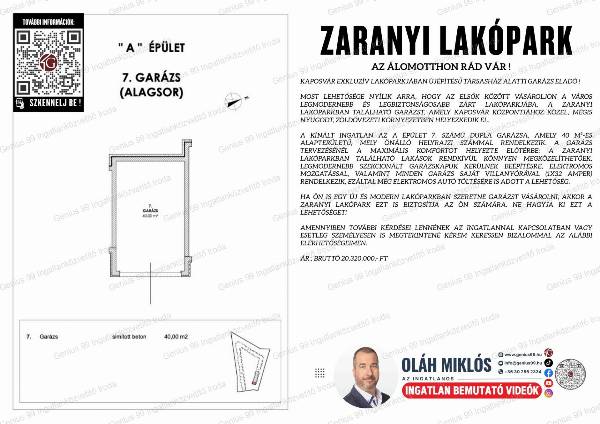 Kaposvár exkluzív lakóparkjában újépítésű társasház alatti garázs eladó ! Most lehetősége nyílik arra, hogy az elsők között vásároljon a város legmodernebb és legbiztonságosabb zárt lakóparkjába, a Zaranyi lakóparkban található garázst, amely Kaposvár központjához közel, mégis nyugodt, zöldövezeti környezetben helyezkedik el. A kínált ingatlan az A épület 7. számú dupla garázsa, amely 40 m²-es alapterületű, mely önálló helyrajzi számmal rendelkezik. A garázs tervezésénél a maximális komfortot helyezte előtérbe: a Zaranyi Lakóparkban található lakások rendkívül könnyen megközelíthetőek, legmodernebb szekcionált garázskapuk kerülnek beépítésre, elektromos mozgatással, valamint minden garázs saját villanyórával (1x32 Amper) rendelkezik, ezáltal még elektromos autó töltésére is adott a lehetőség. Ha Ön is egy új és modern lakóparkban szeretne garázst vásárolni, akkor a Zaranyi Lakópark ezt is biztosítja az Ön számára. Ne hagyja ki ezt a lehetőséget! AMENNYIBEN TOVÁBBI KÉRDÉSEI LENNÉNEK AZ INGATLANNAL KAPCSOLATBAN VAGY ESETLEG SZEMÉLYESEN IS MEGTEKINTENÉ KÉREM KERESSEN BIZALOMMAL AZ ALÁBBI ELÉRHETŐSÉGEIMEN. Ár.: Bruttó 20.320.000.- Ft Érd: +36302562334 https://genius99.hu/ingatlanok/6706990/ Azonosító: A-G-7 A weboldalon szereplő információk (képek, szövegek ... stb.) teljes mértékben a szerző jogi tulajdonát képezik. A weboldalon szereplő információkat, adatokat másolni, felhasználni csak a szerző előzetes engedélyével lehetséges. A tévedés, árváltoztatás és elírás jogát előzetes tájékoztatás nélkül fenntartjuk!