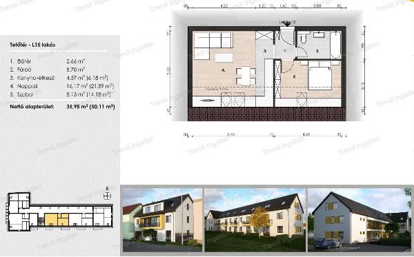 Csorna központi részén épülő 17 lakásos társasházban új építésű lakások eladók. A meghirdetett tetőtérben található bruttó 50,11 nm-es, nettó 35,95 nm-es ingatlanban amerikai konyhás nappali, szoba, fürdőszoba, előtér kerül kialakításra. A lakás fűtéskész ára: 35.000.000 Ft. Kulcsrakész befejezés kérhető. A lakáshoz 1 db gépkocsibeálló tartozik. A minőségi anyagokból épülő tárasház 30 cm-es falazóelemből, 15 cm-es homlokzati hőszigeteléssel épül. A 3 rétegű műanyag nyílászárók kívül fehér színűek. A társasház fűtését hőszivattyú biztosítja, lakásonként egyedi hőmennyiségmérővel, hőleadás padlófűtéssel. A társasház udvarán térkövezett gépkocsibeállók kerülnek kialakításra. Várható fűtéskész átadás: 2026 ősz Bővebb információkért forduljon hozzám bizalommal. Hétköznap és hétvégén is várom hívását! Díjmentes, bankfüggetlen hitelügyintézéssel állunk rendelkezésére. A hirdetésben feltüntetett képek illusztrációk.