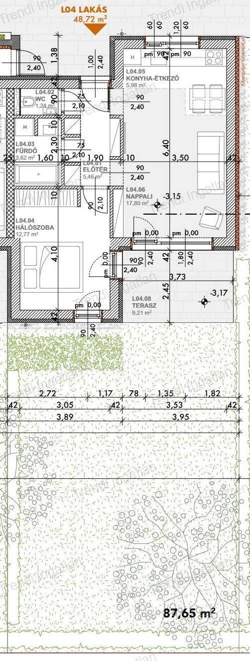 Győr-Szabadhegy mellékutcájában új építésű 28 lakásos társasházban különböző alapterületű lakások eladók. A modern társasházban nappali + 1 szobás, nappali + 2 szobás és nappali + 3 szobás lakások kerülnek kialakításra. A földszinti lakások kertkapcsolattal és terasszal, az emeleti lakások erkéllyel, galériával és tetőterasszal, a penthouse lakások tetőterasszal rendelkeznek. A meghirdetett földszinten található 48,72 nm-es lakásban amerikai konyhás nappali, szoba, fürdőszoba és előtér található. Nappaliból 9,21 nm-es terasz és 87,65 nm-es kertkapcsolat nyílik. A lakás fűtéskész ára: 55.990.000 Ft. Kulcsrakész befejezés kérhető. Gépkocsibeállló ára: 2.900.000 Ft Fedett gépkocsibeálló ára: 4.900.000 Ft Lehetőség van tároló vásárlására is, ára: 3.500.000 Ft – 3.900.000 Ft A társasház 30 cm-es falazóelemből, 15 cm-es homlokzati hőszigeteléssel épül. A homlokzati műanyag nyílászárók 3 rétegűek. Az ingatlanok fűtése kondenzációs gázkazánnal történik, lakásonként egyedi hőmennyiségmérővel és hőmérséklet szabályozó termosztáttal, hőleadás padlófűtéssel. Az ár 1 db klímaelőkészítést tartalmaz. Várható átadás: 2027 tavasz Bővebb információkért forduljon hozzám bizalommal. Hétköznap és hétvégén is várom hívását! Díjmentes, bankfüggetlen hitelügyintézéssel állunk rendelkezésére. A hirdetésben feltüntetett képek illusztrációk.
