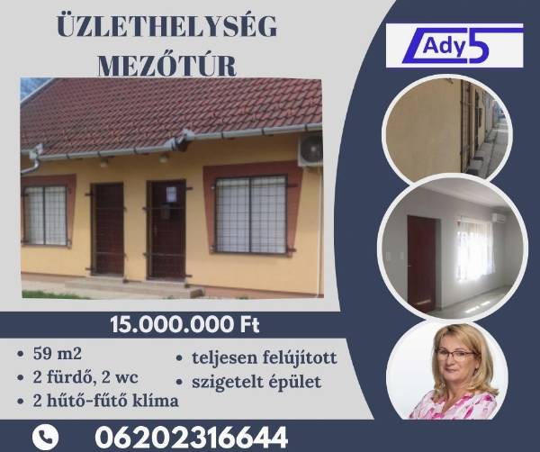 Mezőtúron a piac közelében kínálunk eladásra egy 59 m2-es, utcai bejáratú, kitűnő állapotú, épületet. Tulajdonlap szerint: üzlet megnevezés. Kívül-belül teljesen felújított, vízvezetékek, villanyvezetékek újak. 2 fürdőhelyiség található benne 2 wc-vel. 2 hűtő-fűtő klíma lett beszerelve. A homlokzaton 8 cm szigetelés, a mennyezeten 15 cm szigetelés található. A fa nyílászárók is hőszigeteltek. Az épületben lehetőség van 2 üzlethelyiség kialakítására. A hirdetésben szerepelő információk az eladótól származnak, pontosságukért felelőséget nem vállalunk. Amennyiben felkeltettem érdeklődését, hívjon, nézzük meg együtt.