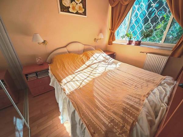 Hűvösvölgyi úton, közel a Szerb Antal utcához, egy parkosított területen található, az úttól távol eső társasházban, egy magasföldszinti, kertre néző, jó állapotú, jó elosztású, erkélyes, kertkapcsolatos lakás. A lakás minden helysége ablakos, a konyhában található egy kis étkezősarok, és egy ablakos kamra is. 2015-ben történt a teljes körű felújítás, beleértve a vezetékeket, és a fűtésrendszert, mely kombicirkó. A nappaliból nyíló loggia Dk-i tájolású, és oldalkert irányába néz, ahonnan egyből le tudunk menni a kertbe. Pincetároló és 1 autó számára kerten belüli gépkocsibeálló tartozik a lakáshoz. Ezenkívül tartozik egy 15nm-es garázs is a lakáshoz, melynek vételára +18M Ft. Különösen ideális azok számára, akik nyugodt környezetre vágynak, mégis fontos szempont, hogy a tömegközlekedés sétatávolságra lenne.