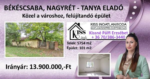 Békéscsaba belvárosától mindössze 6 km-re, az elkerülő és a Békési út találkozásánál eladó egy 5754 m²-es, körbekerített területen fekvő, vegyes falazatú tanya, ahol a csendet csak a természet hangjai töltik meg élettel. Főbb paraméterek: - Telek: 5754 m2 - Épület: 101 m2 - Fal szerkezete: vegyes falazat (tégla + vályog) - Állapot: Felújítás alatt álló - Nyílászárók: Hagyományos fa nyílászárók (2 ablak kétrétegű műanyagra cserélve) - Fűtés: nincs (vegyestüzelésű kazán volt, radiátoros hőleadókkal) - Villamoshálózat 1 fázisú - Vízellátás fúrt kútról megoldott (NEM IVÓVÍZ) - Jó elrendezés (Nappali + 3 különnyíló szoba) Nézd meg az ingatlanról készült videót is: https://youtu.be/Y5xc-NHn6Cc ________________________________________ Irányár: 13.900.000 Ft ________________________________________ Nézzük meg együtt az ingatlant és legyen itt a TE ÚJ OTTHONOD! Kissné Pálfi Erzsébet Kiss Ingatlaniroda - Veled az első lépéstől a kulcsátadásig +36 70/386-3440 ________________________________________ Igény szerint az alábbi ügyek elintézésében is segítek neked: - Ingatlanértékesítés - Ingatlanértékbecslés - Hiteligénylés - CSOK + - Falusi CSOK - Babaváró - Biztosítás - Energetikai tanúsítvány - Birtokba adás - Adásvételi szerződés ________________________________________ #tanya #gazdálkodás #vidék #vidékiélet #szabadság #természet #szomszédmentes #otthon #vidékiotthon #eladóház #eladóingatlan #eladótanya #békésmegye #békéscsaba #békés #gyula #kissingatlan #kissingatlaniroda #kissingatlanok #kissing #ingatlanos #ingatlanvideó #ingatlaneladás #ingatlanbefektetés #ingatlaniroda #ingatlanközvetítő #ingatlanközvetítés