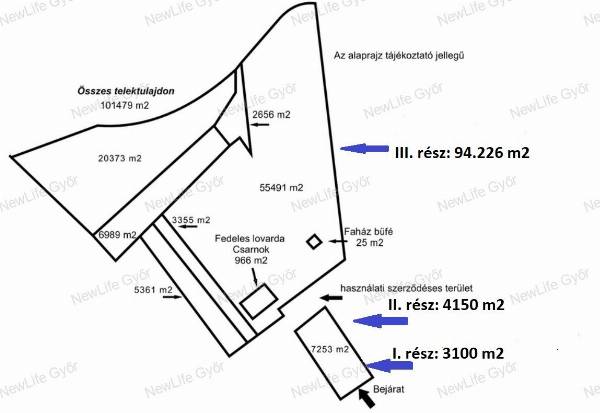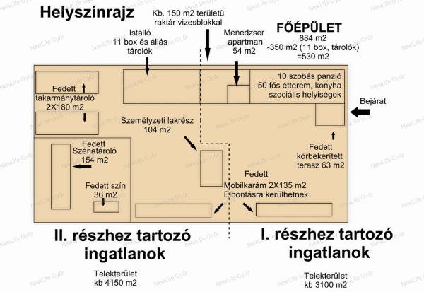 Győr-Moson-Sopron vármegye Győr, Gyirmót, eladó külterületi, ipari-kereskedelmi övezetben többcélú hasznosításra alkalmas telephely. Győrtől néhány percre Fertő-Lajta Hansági nemzeti park szomszédságában 10 hektáron kapott helyet a létesítmény. Távolságok: Győr: 5 km, Autópálya: 4 km, Bécs repülőtér 116 km, Budapest 120 km, Pozsony 70 km, Balaton 80 km Jelenleg sport, szabadidő – és kulturális központként, illetve lovardaként üzemel. Mai formáját közel 25 év alatt érte el. Kiépült és bejáratott, aktív vendégkörrel, méltán ismert és elismert hírnévre tett szert fennállása alatt. Minden részletében az európai szabványoknak megfelelően lett kialakítva. Otthonául szolgál 40 bér tartott lónak, több egyesületnek, szakosztálynak is. Jelenlegi tevékenység is átvehető. A teljes komplexum egyben, vagy akár több részletben is megvásárolható. A jelenlegi bontásban szereplő 3 részt a fotók közti helyszínrajz alapján I., II., illetve III. részre osztva is meg lehet vásárolni. I. rész irányára: 285 MFt, mely a panzió, étterem, konyha, terasz, menedzser lakás és egy 150 m2-es raktárépületet tartalmaz, illetve az ehhez tartozó kb. 3100 m2-es telekterületet. A főépülettel szemben található (egyik) 135 m2 területű fedett mobilkarám, mely szükség esetén bontható, vagy autóbeállók alakíthatók ki belőle. II. rész irányára: 194 MFt, mely tartalmazza a főépület végét, kb 350 m2-nyi, 11 boxot és állást, tárolókat, 2*180 m2 fedett takarmánytárolót, 154 m2 fedett szénatárolót, 34 m2 méretű fedett színt és egy személyzeti komplett lakrészt 104 m2en. A főépülettel szemben található (másik) 135 m2 területű fedett mobilkarám, mely szükség esetén bontható, vagy autóbeállók alakíthatók ki belőle. Földterület kb.: 4150 m2. A komplexum III részének irányára: 165 MFt, mely tartalmaz egy hatalmas területet: 94226 m2 telekrészt fúrt kúttal, öntözőrendszerrel, illetve a 966 m2 területű, acél vázszerkezetű fedeles lovardát, két körülkerített lovas oktatópályát/versenypályát, egy természetes tavat, mely a fedeles lovarda tűzi víztározója is egyben. Ez a hirdetés az komplexum középső (II.) részét hivatott bemutatni. Az ipari-kereskedelmi övezetben elhelyezkedő külterület kb 4150 m2-es telekkel, rajta több épület/építmény. Vegyük ezt sorra: A főépület hátsó szárnya, mely kb 350 m2 vizesblokkal, felosztott raktárrészekkel, tárolókkal. Egy nagyobb része jelenleg állattartásra van használva. Ebből az épületrészből kialakítható többféle tevékenységre alkalmas blokk. Lehet az szállítmányozás, logisztika, raktározás, műhely, csomagoló üzem stb. A főépület után 2 db 180 m2 fedett, oldalt nyitott, jelenleg tárolásra használt építmény tartozik ehhez az ingatlanrészhez. Ezen túl van két téglaépület, melyek teljesen zártak, szintén tárolásra alkalmasak, akár műhelynek: az egyik ilyen 154 m2, míg a másik 34 m2 alapterületű. A telek első részében középen áll egy tégla építésű komplett családi ház, mely 104 m2 (nappali+3 szoba, konyha, fürdőszoba, fűtése vegyes tüzelésű kazánnal, radiátoros hőleadással megoldott) A főépülettel szemben található a telek túlsó részében egy 135 m2 területű fedett mobilkarám, mely szükség esetén bontható, vagy autóbeállók/raktárak alakíthatók ki belőle. A jelen hirdetésben rögzített, az ingatlannal kapcsolatos adatok, információk az Eladó/Megbízó tájékoztatása alapján kerültek meghatározásra. Kérdés esetén hívjon: +36203526426 Befektetőknek is kiváló lehetőség! Hívjon a részletekért! Irodánkban az alábbiakkal tudjuk segíteni a gyors és megbízható ügyintézést: -bankfüggetlen hitel és CSOK ügyintézés -lakástakarék beszámítás -energetikai tanúsítvány -értékbecslés -ügyvédi szerződések, jogi tanácsadás -építészeti tervezés, kivitelezés