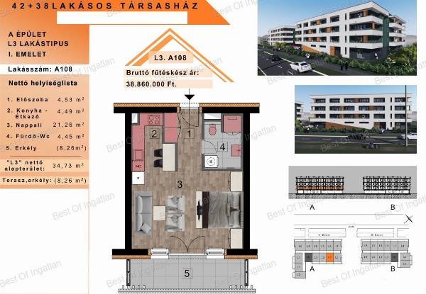 A Best of Ingatlan Győr-Ingatlaniroda, eladásra kínálja,Győr-Szabadhegyen található, új építésű, FŰTÉSKÉSZ (2025. év végi átadással) VAGY KULCSRAKÉSZ (2026. nyári átadással) társasházi lakásokat! Válogasson kedvére a különböző méretű és elrendezésű lakások között. Legyen Ön a tulajdonosa egy új építésű, szép lakásnak. 42 + 38 lakásos, két épületből, két ütemből álló liftes társasház egy 5580 m2-es nagy telekre épül Győr-Szabadhegyen. Az első ütem lakásaiból kedvére válogathat: 34,73 m2 - 69,13 m2-es lakások, mindegyik erkély vagy teraszkapcsolattal, fűtéskész állapotban vagy akár kulcsrakész állapotban 2026. nyári átadással leköthetőek. A liftes társasház monolit vasbeton tartószerkezettel, belső téglafalakkal épül, a külső falaknál 20 cm, a a tetőn 35 cm szigetelést kap. A külső nyílászárók 3 rétegű üvegezéssel készült ablakok. Az épület távfűtéses, modern lapradiátoros hőleadókkal, egyedi mérőórákkal, alacsony rezsivel! Hűtő-fűtő split - klíma előkészítése minden lakásban megtörténik. Igény szerint épület alatti fedett parkoló vásárolható, melyek vételára 5.080.000,-Ft, vagy zárt udvari parkoló vételára: 2.540.000,-Ft. Az ingatlan földszintjén lévő, különböző méretű tároló (2,55 m2-6,48 m2) megvásárlására is van lehetőség, melyek vételára méretétől függően 2.200.000,-Ft - 5.800.000,-Ft. A kerítéssel körbevett, rendezett, parkosított fásított udvarra elektromos kapun keresztül juthatunk be, ahol pihenő, játszótér és udvari locsoló hálózat is megtalálható. A hirdetésben szereplő L3. típusú, 1. emeleti, D-K-i fekvésű, erkélyes lakás 34,73 m2 + 8,26 m2 erkély Belső elosztása: előszoba, konyha + étkező, nappali, fürdőszoba wc-vel, + erkély. Fűtéskész ára: 38.860.000,-Ft. Kulcsrakész ára gépesített konyhabútorral: 46.000.000,-Ft Szeretne ebben az idilli környezetben elsőként élvezni a lakóövezet nyújtotta előnyöket, valamint igényeit , terveit megvalósítani? Hívjon bizalommal, hogy személyesen is mihamarabb bemutathassam Önnek az új otthonának színhelyét! Fülöpné Máté Ildikó Best Of Győr Ingatlan + 36/30 993-2787 bestofgyor@gmail.com További szolgáltatásaink: díjmentes, bankfüggetlen hitelügyintézés értékbecslés energetikai tanúsítvány ügyvédi ügyintézés biztosítás