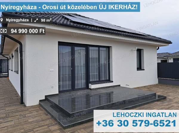 Nyíregyháza - Orosi út közelében, Lakóparki környezetben, igényes, szép családi házak környezetében, megbízható, komoly referenciákkal rendelkező kivitelezőtől eladó egy 97,50 nm-es, nappali - amerikai konyha + 2+1 fél szobás, GÉPESÍTETT KONYHABÚTORRAL, NAPELEMMEL FELSZERELT, AZONNAL KÖLTÖZHETŐ, ÚJ ÉPÍTÉSŰ IKERHÁZ, 400 nm-es telken! Az ikerházi lakásoknak nincs közös fala, csak a kerítésnél vannak összeköttetésben! Az ingatlan főbb jellemzői: Lakótér:79.50 nm + 18,00 nm garázs Porotherm 30 tégla falazatú, AUSTROTHERM GRAFIT homlokzati hőszigeteléssel, Fokozottan hőszigetelt, 3 rétegű üvegezésű, műanyag nyílászárók, Födémszerkezete fa födém, szigeteléssel ellátva, Tető héjazata antracit színű TERRÁN cseréppel fedett, Fűtése gázcirkó rendszerrel megoldott, minden helyiségben padlófűtéssel, 3.2 kW teljesítményű napelem rendszer, Víztisztító berendezés, Elektromos redőnyök, Beépített szúnyogháló, Minőségi függönyök, Gépesített, minőségi konyhabútor, Déli tájolású terasz Az építtető egy a mai kor igényeit minden tekintetben kielégítő időtálló és igényes minőséget követel meg a tervezett beruházás eredményeként létrejövő épülettől, mely megfelel a hosszútávon jelentkező igényeknek. Díjmentes hitel, OTTHON START, Babaváró, Biztosítások ügyintézése! Ügyfeleink számára minden szolgáltatásunk DÍJMENTES! Tel:+36 30 579 6521 Lehoczki Mihály Ingatlanközvetítő