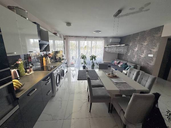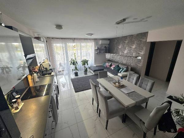 Ács kertvárosi részén 2021-ben átadásra került, újszerű állapotú, 78-nm-es, kertkapcsolatos, nappali plusz 3 hálószobás ingatlan, saját zárt parkolóval, rendezett tégla építésű, kevés lakásos társasházban. INGATLNAN ELOSZTÁSA: Előszoba, amerikai konyhás nappali, három hálószoba, fürdő wc egy helyiségben és külön is,(dupla komfort) saját kert kapcsolattal. MŰSZAKI ÉS ESZTÉTIKAI JELLEMZŐK: Az ingatlan 4 évvel ezelőtt került átadásra minden újszerű állapotú. Hőszivattyús rendszerrel ellátott társasház. Melegről padlófűtés gondoskodik, 1 db nagy teljesítményű hűtő-fűtő klíma a nappaliban lett elhelyezve. Egyedileg kért az építésnél hideg meleg burkolatok, egyedi kerítés. Minden nyílászáró elektromos redőnyökkel működnek. Az ingatlanban a képeken látható konyha gépesítés(sütő, mikró, szagelszívó, mosógép, szárítógép, hűtő, étkező asztal székekkel.) Szobákban ágyak francia ágy, szekrények, bútorok a vételár részét képezik. Rezsi költsége az ingatlannak: Közös költség: 15.000.- ft + 2.000.- ft felújítási alap, áram havonta: 10-12.000.- ft, víz két havonta 8.000.- ft, fűtés egy évre 30.000.-ft KÖRNYÉK, INFRASTRUKTÚRA: Cukrászda, Penny, Príma, OTP bank, kávéház, állatorvosi rendelő, Óvoda. KÖZLEKEDÉS: 8687-8479-8661-8662-8663-8666 volánbusz megálló közvetlen közelben, G10-s-S10-Sz vonatok, M1-es autópálya. A parkolás udvaron saját számozott beállóhely, de a ház előtt is megoldható a lakók részére. AZ INGATLAN BANKI HITELRE IS MEGVÁSÁROLHATÓ. VEVŐINK RÉSZÉRE A KÖZVETÍTÉS DÍJMENTES. A HIRDETÉSBEN SZEREPLŐ ADATOK TÁJÉKOZTATÓ JELLEGŰEK