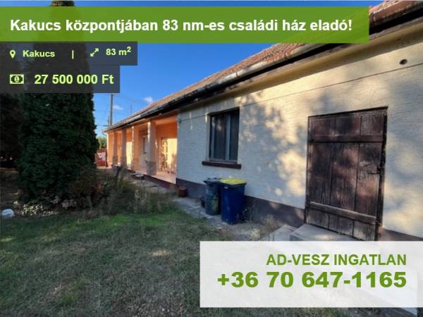 Eladó Kakucs központjában egy 83m2-es felújítandó gangos családi ház 663m2-es telekkel! Az 60-es években tégla alapra, vályogból épült családi házban 2 szoba, konyha-étkező, fürdőszoba, külön bejáratú kamrák kerültek kialakításra. Fűtése konvektorokkal megoldott, közművek közül a villany, víz, gáz kiépítése történt meg. Egy kis ráfordítással, takaros otthont lehet belőle kialakítani. Buszmegálló, boltok, óvoda, iskola mind pár perc sétával elérhetőek. Kakucs, a Budapest környékén lakóhelyet keresők részére az egyik legideálisabb választás. Ingázóknak a Budapestre jutás, az M5 autópálya közelsége miatt praktikus, és könnyen kivitelezhető. Kitűnő választás, ha Budapesthez közel egy rendezett települést keres. Jöjjön, nézze meg, tegyen rá ajánlatot! Az ingatlan kizárólag irodánk kínálatában megtalálható. Hitelügyintéző kollégánk államilag támogatott kamatozású hitelkonstrukciókkal, és CSOK teljeskörű ügyintézéssel áll rendelkezésére térítésmentesen! Az adásvételi szerződés megkötéséhez igény szerint megbízható ügyvédi közreműködést biztosítunk. Amennyiben az ingatlan felkeltette érdeklődését, kérem, hívjon bizalommal. Kecskésné Bábel Andrea +36706471165
